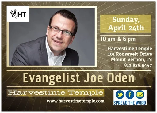 This is going to be an AWESOME weekend of ministry at Harvestime. Evangelist Joe Oden will be speaking in 2 great services on Sunday, April 24th. Services will be at 10:00am & 6:00pm. Start now to invite your family/friends for both services,