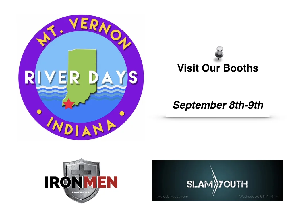 ✚ gCal ✚ iCal Once again this year -- IRONMEN & SLAM -- will both be having food booths at the MV River Days. Our booths will be open on Friday & Saturday (September 8th-9th). Signup today to help out.